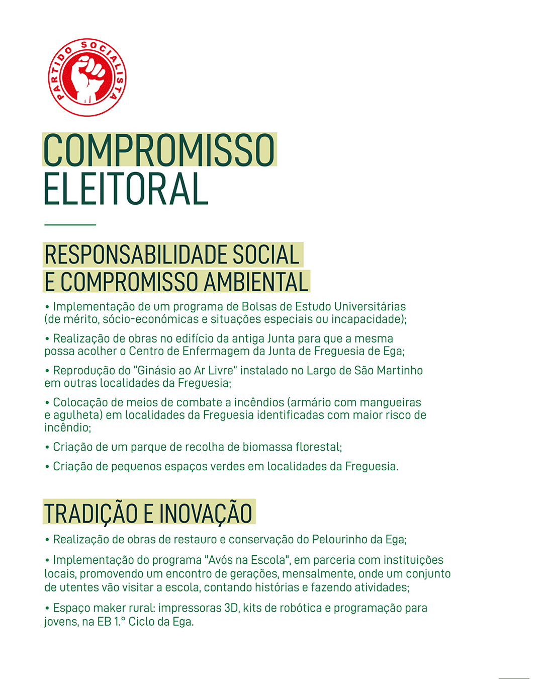 Esta candidatura representa a continuidade de um projeto que tem como pilares a proximidade às pessoas, o desenvolvimento sustentável e a valorização da identidade local e é um compromisso renovado com transparência, proximidade e trabalho sério. A Freguesia merece continuar a crescer com ambição, equilíbrio e respeito pelas suas raízes.