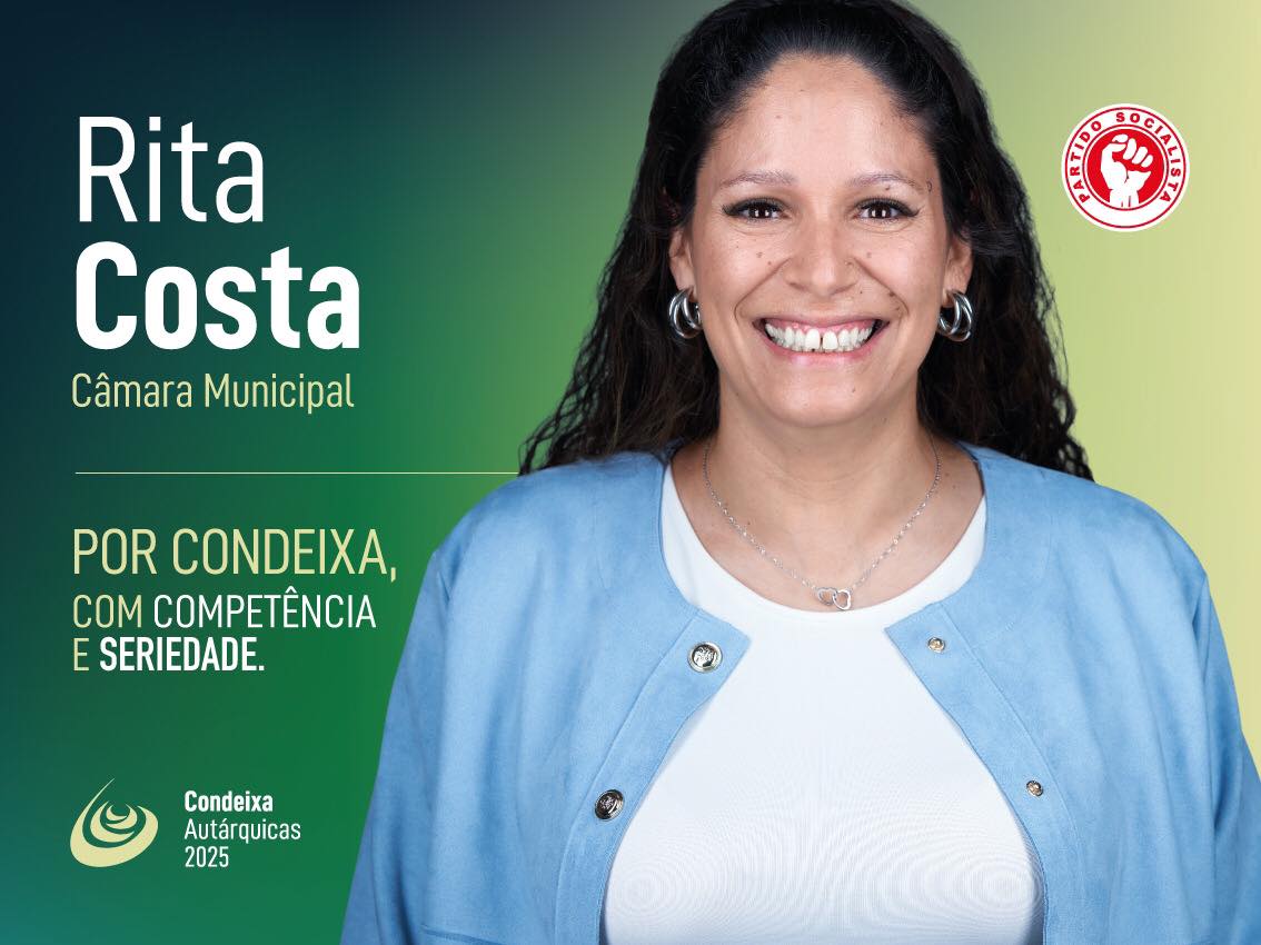 Rita Costa tem 41 anos, é natural e residente em Condeixa-a-Nova, onde cresceu, estudou e onde escolheu criar a sua família. Enraizada na comunidade condeixense, Rita representa uma geração ativa, versátil e comprometida com o serviço público e o associativismo local.