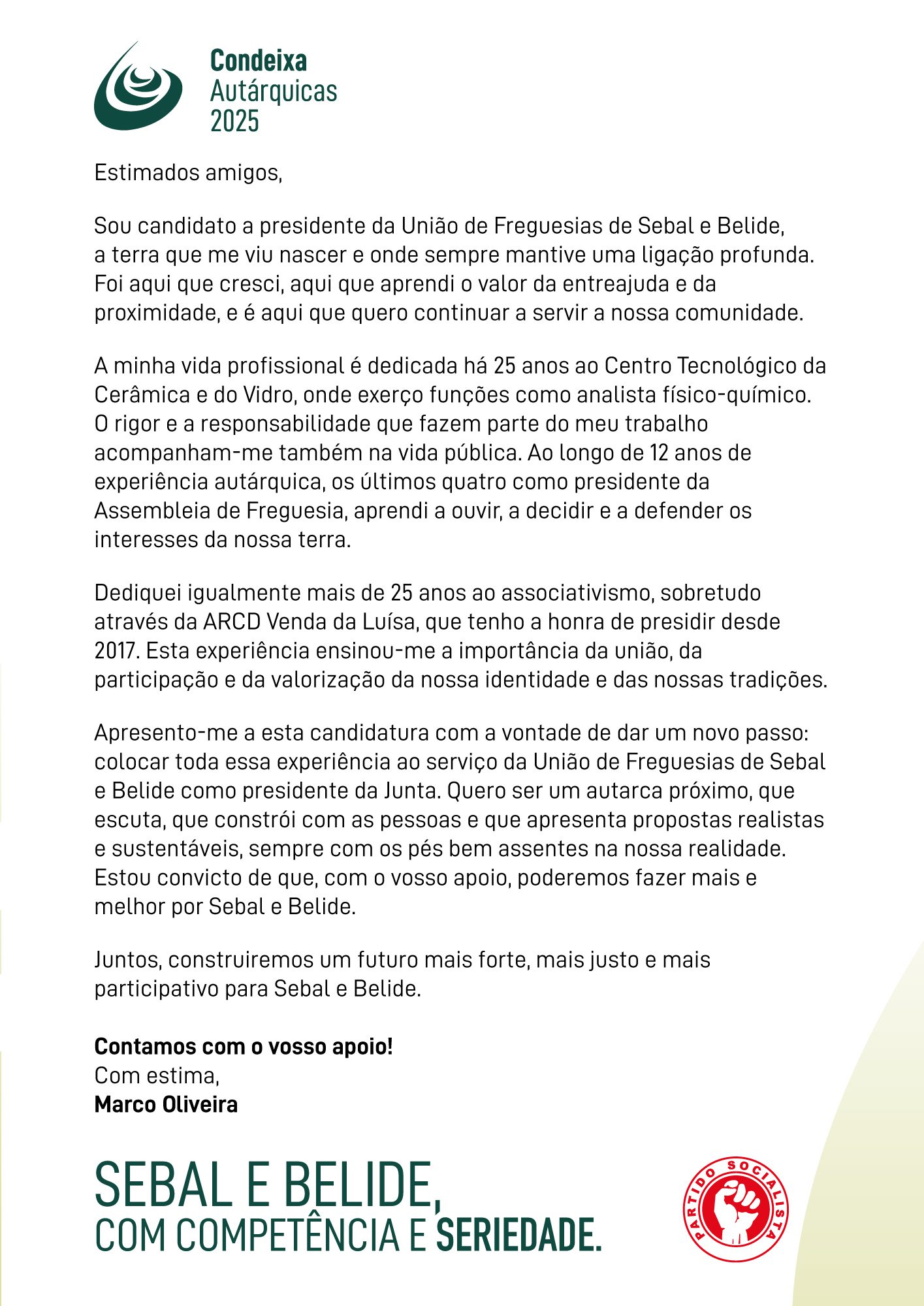 Sou candidato a presidente da União de Freguesias de Sebal e Belide, a terra que me viu nascer e onde sempre mantive uma ligação profunda. Foi aqui que cresci, aqui que aprendi o valor da entreajuda e da proximidade, e é aqui que quero continuar a servir a nossa comunidade.